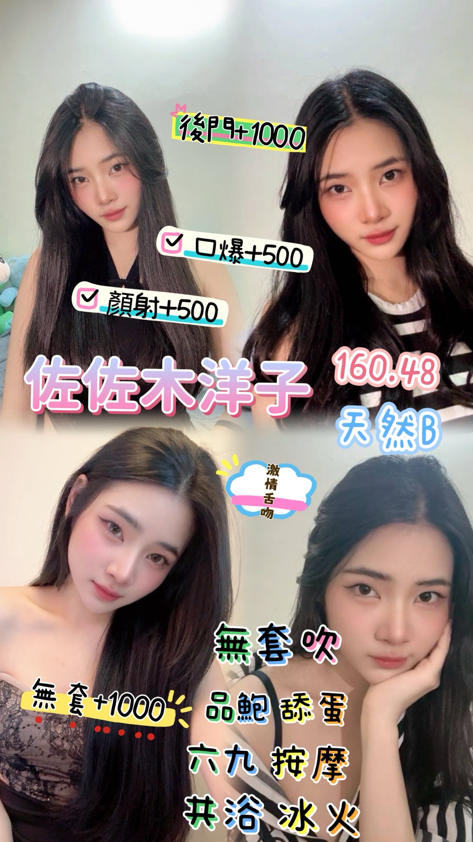 口爆 - NT$500, 顏射 - NT$500, 無套外射 - NT$1000, 後門 - NT$1000, 無套內射 - NT$1500