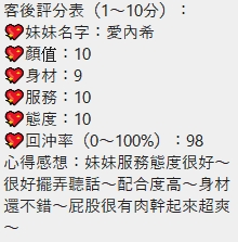 自慰秀 - NT$500, 口爆 - NT$500, 顏射 - NT$500, 吞精 - NT$1000, 禁臉攝影 - NT$1000