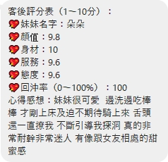 艷舞秀 - NT$300, 口爆 - NT$500, 自慰秀 - NT$500, 顏射 - NT$500, 無套外射 - NT$1000